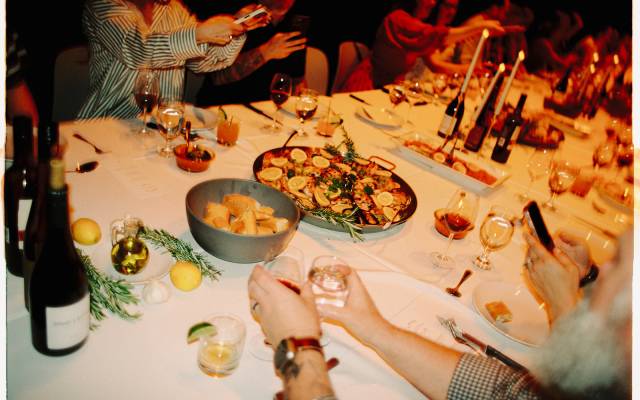 People gathered around a long white table
